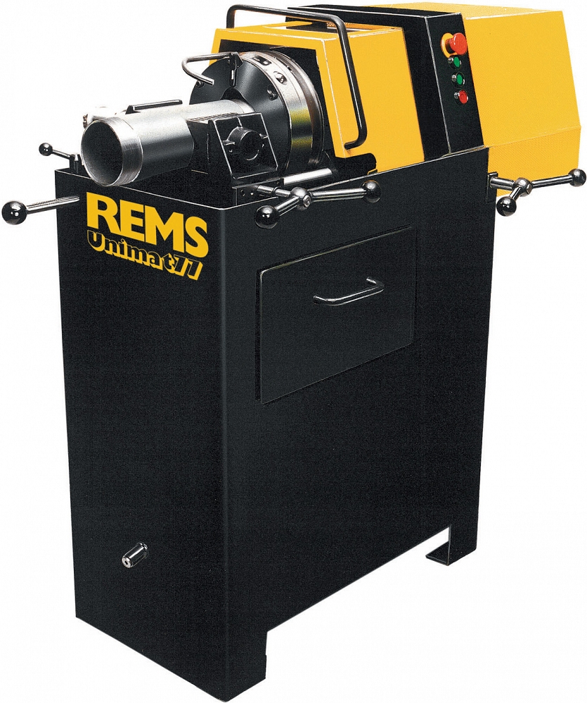- Rems Унимат 77 базовый. Полуавтоматический резьбонарезной станок для трубной резьбы 1/4" – 4". Станок на подставке. 3-х фазный двигатель с переключением полярности 380 / 400 В, 50 Гц, 2 / 2,3 кВт, правый и левый ход. Скорости вращения резьбонарезной головки 50, 25, 16 и 8 об/мин. Универсальные тиски с зажимными губками 1" – 4", на выбор ручные или пневмо-гидравлические. Устройство для автоматического охлаждения и смазки. Всего одна универсальная автоматическая резьбонарезная голова для всех видов резьбы, автоматически закрывающаяся и открывающаяся. Без резьбонарезного набора, без фиксатора. Защитный экран с электрическим управлением. Установочная планка, рабочий ключ. В ящике для транспортировки.