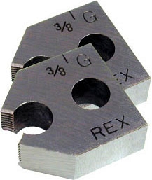 Резьбонарезные гребенки для ручного клуппа Rex 2RG Dies 10A (Рекс 2РГ Дайс 10А) предназначены для нарезки правой трубной конической резьбы BSPT R на трубах Ø 3/8". Используются с ручным резьбонарезным клуппом Rex 2R3 и 2R4.